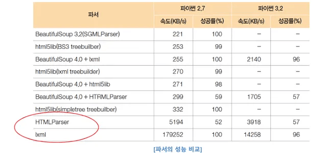 - 전통적인 파이썬 XML 파서(XML Parser)에는 lxml과 htmlslib 드이 있으며, Beautifulsoup모듈은 이를 차용하여 데이터를 쉽고 빠르게 처리함