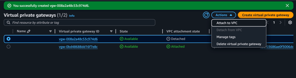 그 이후, 생성한 Virtual Private Gateway에 연결하려는 VPC를 Attach 시켜줍니다.