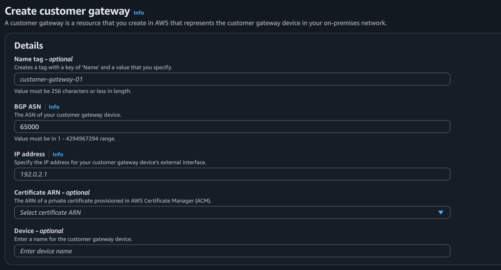 • BGP ASN은 기본값으로 두어도 되고, 다른 값으로 변경해서 넣어도 된다.