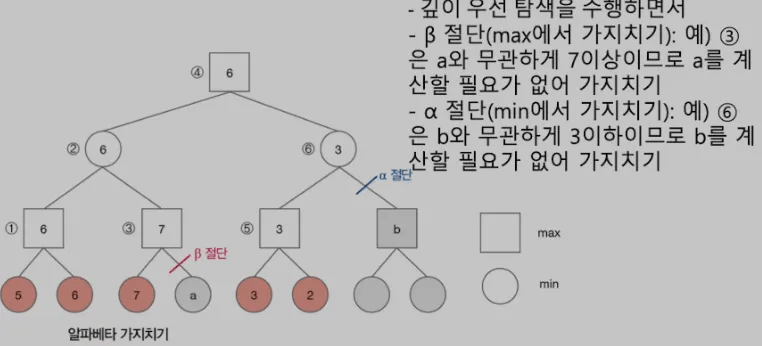 Minimax을 개선한 적대적 탐색방법으로써, MAX가 찾아 놓은 최선값인 알파값을 유지하여 후보 노드의 좋은 정도가 알파값 보다작을 경우 가지치기를 함으로써 보다 효율적인 탐색 수행