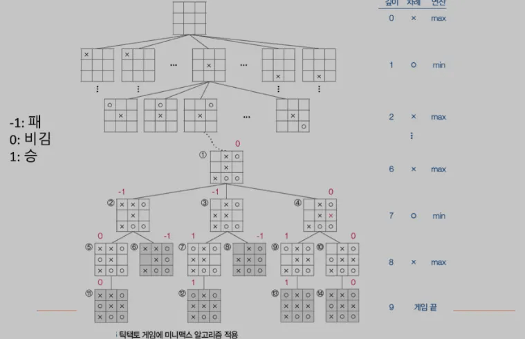 - 상대 차례에서는 min을 적용(상대의 최적의 수는 나에게 최악의 수이므로 min 적용.)