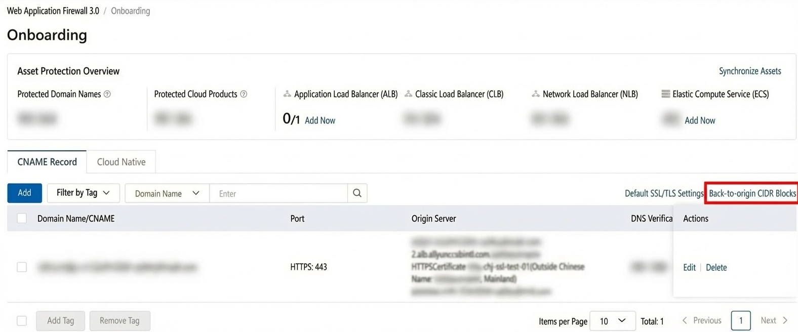 - Origin Address(원본): WAF가 발급한 CNAME (xxxx.aliyunwaf.com) (WAF 구성 시 생성되는 CNAME)