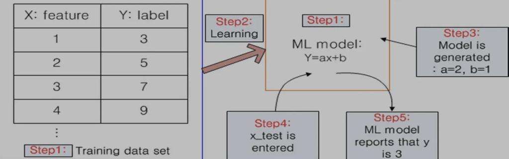 - step 4 : 생성된 ML 모델에 x_test라는 값을 입력하여 y의 값을 물어봄